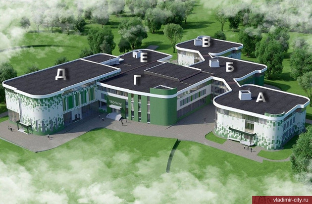 "А", "Б", "В" - учебные блоки, "Г" - главный вход и актовый зал, "Д" - бассейны и спортивный зал, "Е" - учебно-хозяйственный зал.