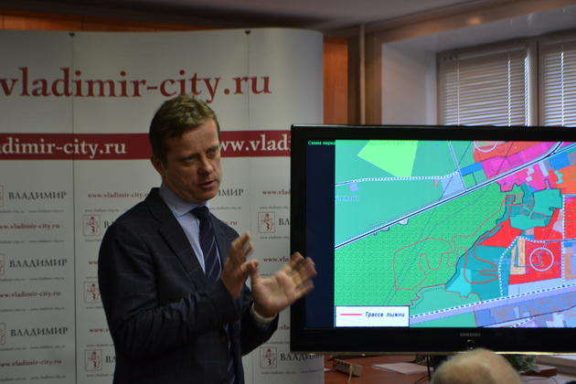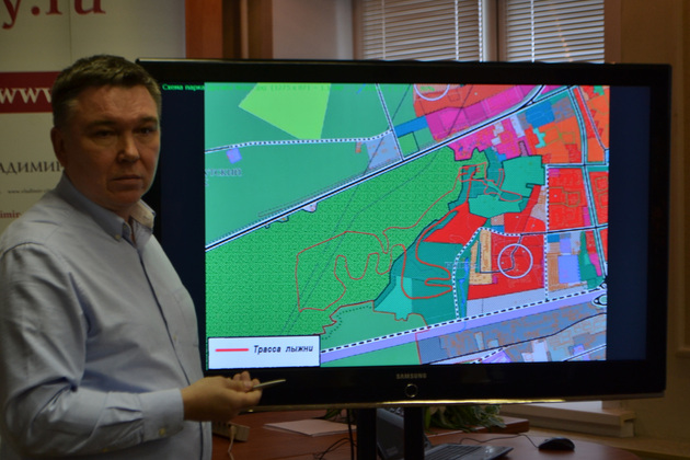 Лыжная трасса была особо выделена на схеме, которую показывали на большом экране. В центре внимания был красный многоугольник — тот самый участок под застройку, вокруг которого идут столь острые споры.
