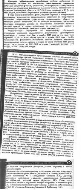 Как следует из отчёта, в ходе проверки Счетной палаты были установлены факты, свидетельствующие о неэффективном распоряжении департаментом здравоохранения средствами, выделенными во Владимирской области на обеспечение лекарствами льготных категорий граждан. Действия департамента не позволяли медицинским учреждениям области эффективно планировать расходы на лекарственное обеспечение льготников, что в конечном итоге приводило к осуществлению закупок у единственного поставщика без проведения конкурсных процедур.
