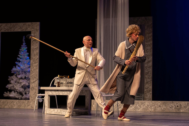 Сюжет пьесы Скороходовой и, соответственно, спектакля заковыристым не назовешь — в нем нет интриги. Но прелесть в деталях: в жестах, мимике, интонациях актеров и, конечно, в диалогах, которые у автора получились очень живыми и жизненными. «Займитесь спортом — засосет». «Жена — вечно недовольная баржа». «Даже такой товар нынче подбирают»... Зал реально веселился на премьере. Не зря «Новый год forever» очень любят ставить российские театры. История-то трагикомичная, но — поднимающая настроение. Особенно когда, как во владимирской постановке, некоторые ключевые сценки сопровождаются удачной клиповой «поддержкой» на большом экране. За видео (в нужном месте) взлетов космических кораблей режиссеру и сценографу Вадиму Романову отдельное спасибо — тонко повеселил.