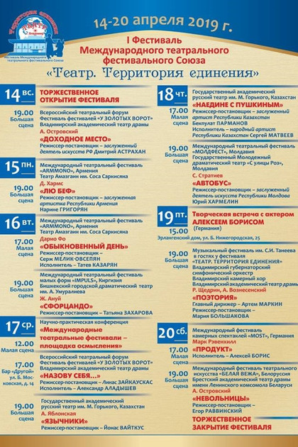 Все спектакли во Владимире пройдут на русском языке, причем, некоторые — впервые. Увидеть их владимирцы смогут по 20 апреля включительно, но билеты на фестивальную неделю раскупаются на «ура». Кроме того, в программе значится научно-практическая конференция с участием ведущих экспертов в области театрального дела стран-участниц форума.