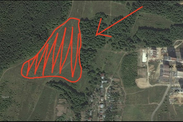 Спасенный лес показан стрелкой, зона застройки - штриховкой. Фото из группы "Спасем парк Дружба" ВКонтакте.