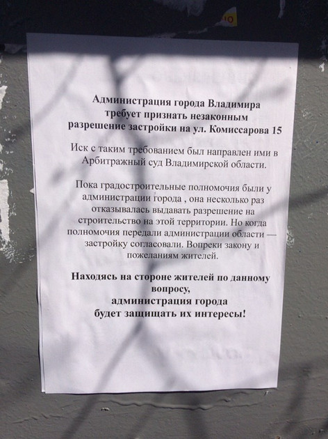 Примечательно, что мэрия Владимира пытается делать вид, что не имеет никакого отношения к возможному появлению в этом районе многоэтажек. Более того, за полтора года до следующих выборов чиновники и депутаты городского совета заявляют о полной солидарности с позицией местных жителей в этом вопросе.