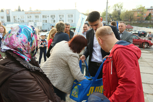 Примерно в 11.30 поезд на 20 минут остановился на станции Костерево. «С днём рождения, Владимир Вольфович!» – закричали из толпы, когда в дверях вагона появился лидер ЛДПР. «А почему так мало людей! – удивился вождь партии. – 10 тысяч должно быть!». «Так все же на работе!» - оправдывались костерёвские. «А мы привезли вам подарки! Пасха же!», – обрадовал граждан Жириновский. Подарки – футболки и бейсболки с символикой ЛДПР – уже раздавали немного в стороне – в фургоне ЛДПР.