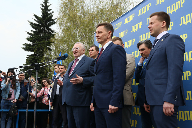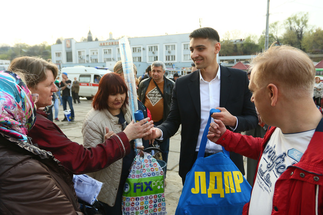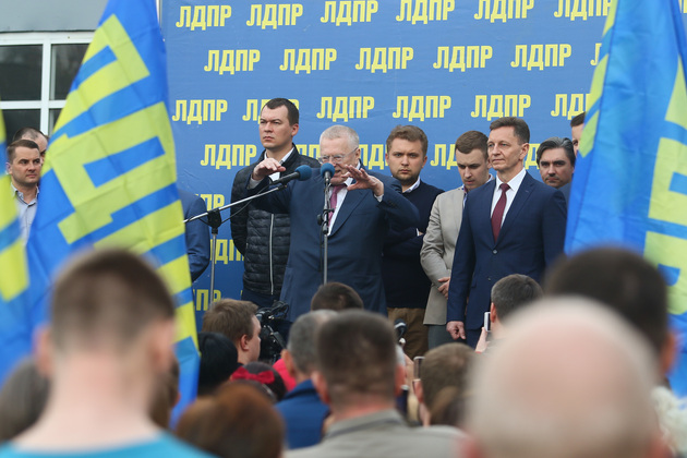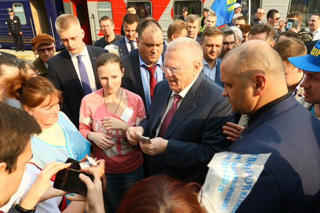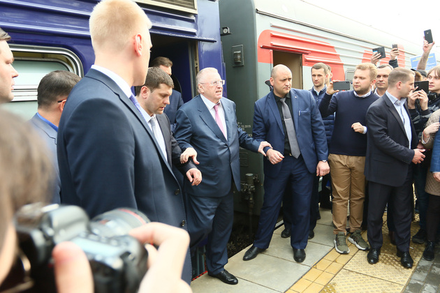Поезд делал остановки по пути следования. На станции сразу же начинался митинг. Реяли стяги ЛДПР, по перрону сновали юноши в партийной униформе, за порядком бдительно следила полиция.