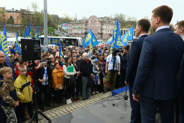 После небольшой остановки в Боголюбове – перед участниками мероприятия там открылся прекрасный вид на Боголюбовский монастырь – состав прибыл в столицу губернии Владимир. Здесь снова Жириновского встречали песнями и танцами. Со стороны вокзальной площади была установлена основательная сцена. Зазвучал гимн ЛДПР. Очень красивая музыка, кстати.