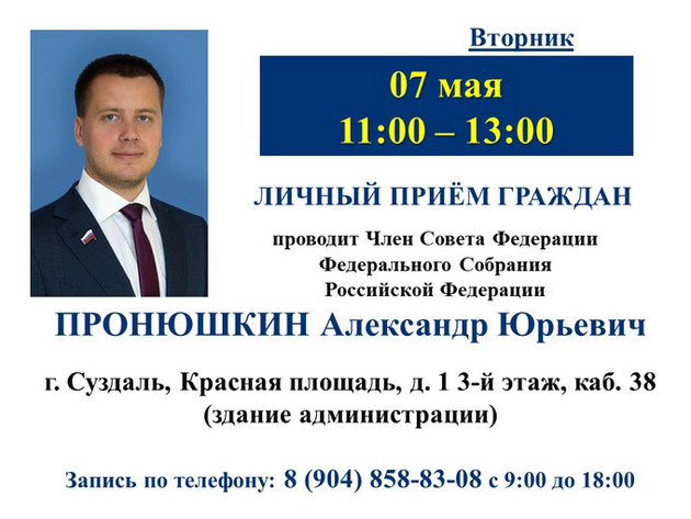 Член Совета Федерации Федерального Собрания Российской Федерации Александр Пронюшкин 7 мая проведет приём граждан в Суздале.