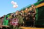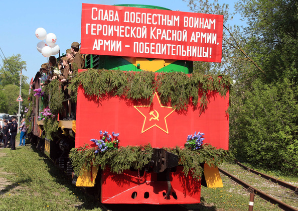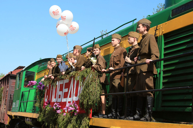 «Эй, встречай, да крепче обнимай, чарочку хмельную полнее наливай!» – прямо напротив кладбища остановился поезд из двух вагонов: в первом – «теплушке» – граждан приветствовали старшеклассники школы № 36, во втором – на открытой платформе плясали и пели артисты театра «Разгуляй». Подобный перформанс возвращения солдат с фронта во Владимире прошёл впервые. Артисты танцевали вальс Блантера. «С берез неслышен, невесом, слетает жёлтый лист…» Но первая зелень ещё только вовсю распустилась. Запели – но, разумеется, давно уже под другие слова «Выпьем за Родину, выпьем за Сталина!» («Волховская застольная»). Спели и «Хотят ли русские войны?» и, разумеется, про «День Победы».