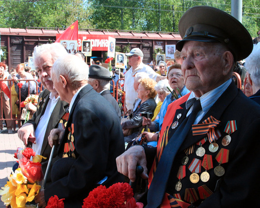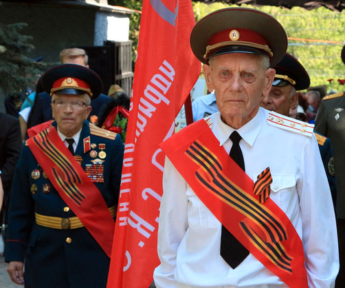– Мы рождены, чтоб сказку сделать былью, – играл городской духовой оркестр у ДК Молодёжи. Звучали и другие бравурные марши. К 10 часам утра была сформирована колонна, заполнившая всю улицу Мира. Во главе её ехал «уазик» с ветеранами, шёл духовой оркестр, и красиво маршировали учащиеся кадетских классов. Под музыку оркестра шествие двинулось к Князь-Владимирскому кладбищу. Многие из его участников несли портреты своих родственников-фронтовиков, кто-то шёл с детьми или вёз их в колясочках.