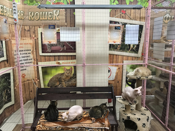 Несмотря на будний день, недостатка в людях на выставке не было. Вольеры хоть и выглядят просторными, но когда внутрь заходит трое взрослых и двое детей, места катастрофически не хватает. Одна из посетительниц нечаянно наступает кошке на хвост. Животное громко кричит – это, пожалуй, единственное «яркое» проявление эмоций от пушистых жителей «Федерации…» В основном кошки либо спят, либо прячутся в своих кошачьих домиках.