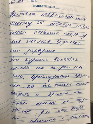 Люди и дети на выставке выглядят счастливыми – они с удовольствием тискают кошек и фотографируются с ними. Но если открыть «Книгу отзывов», то становится понятно, что далеко не все довольны «Федерацией кошек». На 1 позитивный приходится 5 негативных отзывов. В социальных сетях ситуация ещё хуже. На официальной страничке выставки «Вконтакте» люди оставляют в основном хорошие комментарии: «Посещение доставило исключительно положительные эмоции. Кошки дружелюбны и выглядят очень достойно». Встречаются и мнения негативного характера, но редко. Администрация группы отвечает максимально вежливо, чтобы урегулировать конфликт. Создаётся впечатление свободы мнений: «Спасибо за ваш отзыв! Очень жаль, что вам не понравилась наша выставка, но, сколько людей, столько и мнений». На самом же деле существует ещё одна, вторая группа, под названием «Анти Федерация кошек». Оказывается, что многих негативных комментаторов в официальном сообществе добавляли в чёрный список, а их отзывы удаляли. Видимо, свобода открыто выражать свою позицию заканчивается там, где начинается желание скрыть неприятные факты.