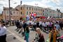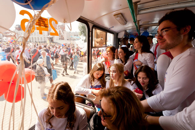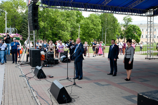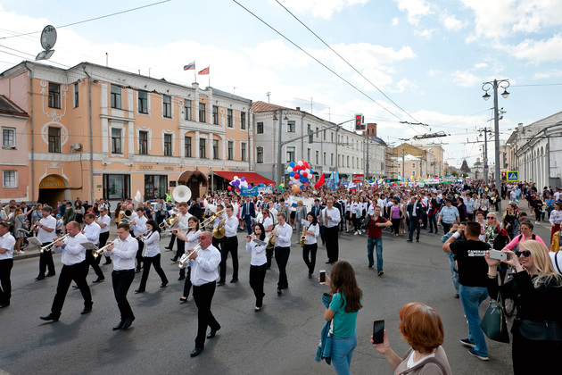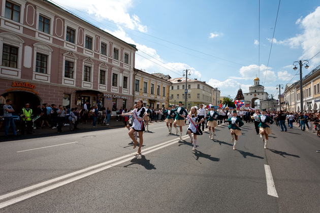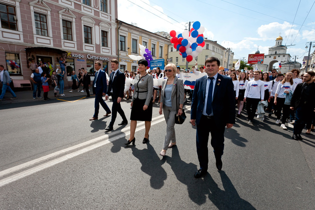 После традиционных линеек в школах, выпускников специальным транспортом "Выпускник 2019" привезли к Золотым воротам, откуда дружной колонной парад проследовал до Соборной площади. Там для участников торжества был организован концерт. Перед началом концерта для ребят прозвенел импровизированный последний звонок - перезвон десятков колокольчиков.