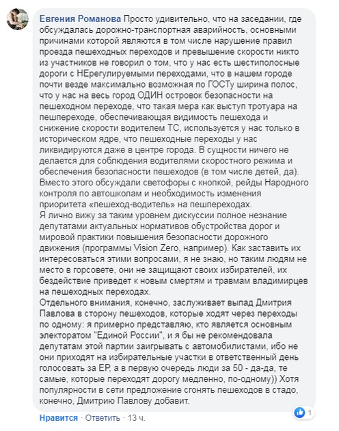Напомним, 23 мая на заседании комитета по вопросам местного самоуправления Совета народных депутатов города Владимира Дмитрий Павлов заявил: «Я бы лично рассмотрел возможность внесения изменения в ПДД относительно того, чтобы люди переходили переход не по одному человеку, как сейчас неспешно, вереницей. И отсюда возникает отсутствие дисциплины с детьми. А нужно, чтобы переходили группами не менее условно 3 человек. И только тогда они будут приоритетом».
