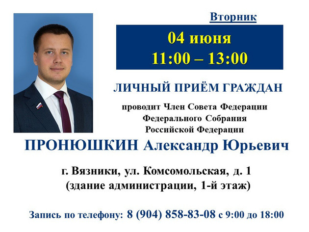 4 июня член Совета Федерации Федерального Собрания Российской Федерации Александр Пронюшкин проведет личный прием граждан в Вязниках.