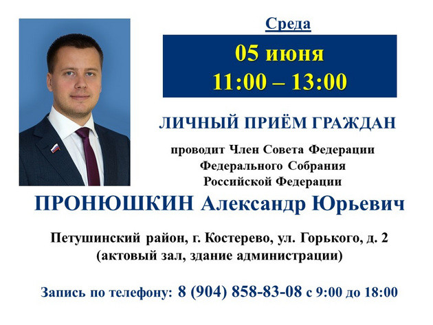 Член Совета Федерации Федерального Собрания Российской Федерации приглашает граждан в среду, 5 июня.
