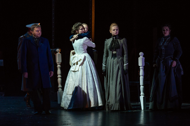 Но в спектакле Кузнецова в роли Каренина оказался один из самых моих любимых актеров владимирского театра Анатолий Шалухин — с его невероятной внешней уютностью и добрющими глазами. Анной стала супруга режиссера, изящная шатенка Ариадна Брунер, буквально излучающая сдержанность и достоинство. Роль Вронского отдали молоденькому Ивану Антонову, которого мне было легче представить подкармливающим бездомных котят и переводящим пожилых людей через дорогу, чем губителем девиц и замужних женщин. Ну и Долли — прекрасная, статная Анна Зайцева, которая, даже не желая быть яркой, не может ею не быть...