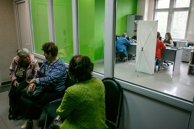 Сотрудники офиса говорят, что еще через два часа очередь сократится до пяти человек, а к концу рабочего дня и вовсе до одного. Но народ все равно приходит задолго до открытия офиса. Разве что номерки на руках не пишут.