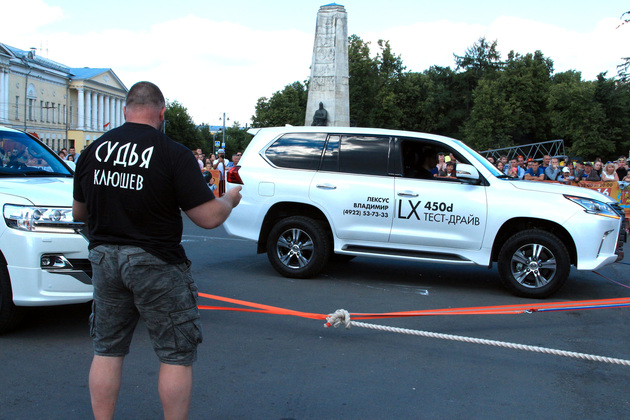 Самым зрелищным состязанием силового экстрима стало упражнение, обозначенное как «арм оф арм» – буксировка автомобилей с помощью каната. На Соборной площади стояли четыре джипа. Богатыри должны были с помощью канатов подтянуть их как можно ближе к себе. На каждого силача приходилось по два джипа. Однако не всем оказалось по силам сдвинуть автомобили больше чем на метр. И немудрено: автомобили стояли под небольшим уклоном и постоянно скатывались назад. Силачи малость притомились, и судьи после небольшого совещания решили, что на каждого богатыря достаточно и одного авто. И дело пошло! И опять владимирские силачи оказались лучшими: они подтянули тяжёлые машины, можно сказать, прямо к своим ногам. А если понадобилось бы, я уверен, затащили бы их и куда дальше! Не перевелись всё же богатыри на Руси! Публика была в восторге. Женщины просто визжали.