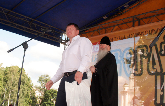 На сцену вышли директор департамента по физической культуре и спорту администрации Владимирской области Алексей Сипач и митрополит Владимирский и Суздальский Тихон.