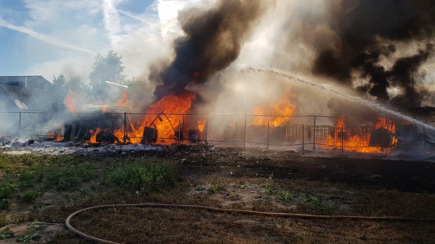 Утром, 24 июня в поселке Новки Камешковского района загорелись 2 автомобиля и склад с ГСМ.