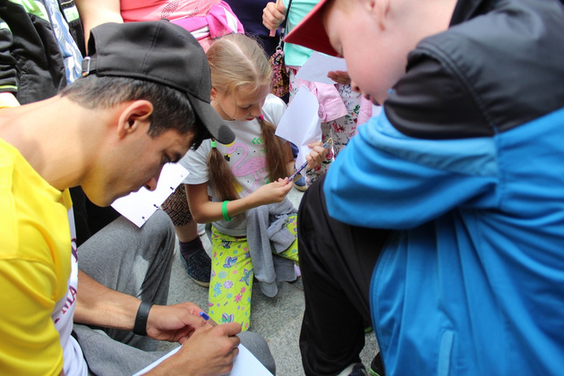 В течение 40 минут ребята делали гимнастику под руководством фитнес-инструктора спортивного клуба «Бостон» Александры Ратниковой и Ильгара Гусейнова. По окончании зарядки участники акции смогли сфотографироваться с чемпионом и взять у него автограф.