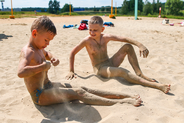Берег озера и вправду похож на настоящий пляж. Широкая прибрежная полоса отсыпана песком. Для детей установлены «грибочки». Отдыхающие загорают и на песке, и на лужайке чуть подальше от кромки воды. Для тех, кому просто жариться на солнце скучно, есть турник, волейбольная сетка...