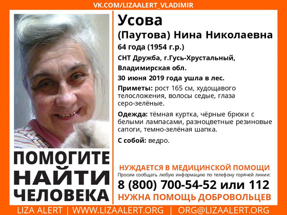 Нина Николаевна Усова (Паутова) пропала 30 июня в районе СНТ "Дружба" Гусь-Хрустального района.