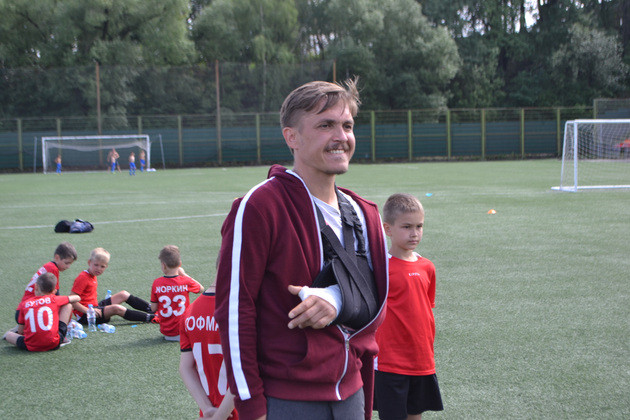 Алан и сам с футболом не расстается. Руководил игрой ребят, а у самого левая рука сломана, на перевязи: говорит, получил травму в игре чемпионата области. На футболках мальчишек из «Спарты» под руководством Алана Боллоева читаются фамилии, известные во владимирском спорте, — Дубровин, Гофман и другие.