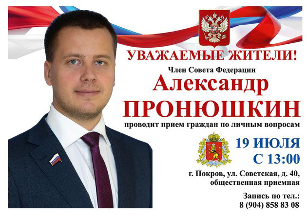 19 июля член Совета Федерации Федерального Собрания Российской Федерации Александр Пронюшкин проведет личный прием граждан в Покрове.