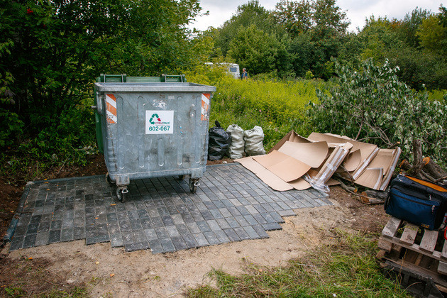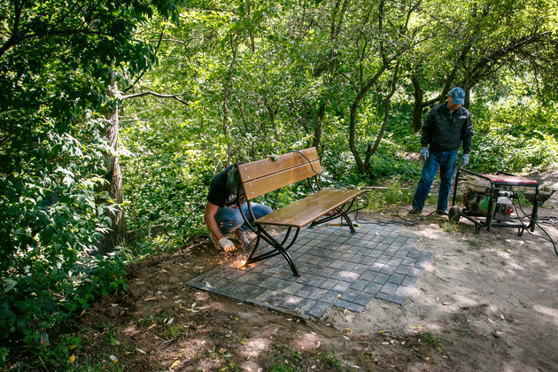 Чтобы люди не сидели в грязи (в парке нет твердого покрытия), площадки вокруг лавочек были вымощены плиткой, которую предоставил постоянный спонсор Арт-субботников - компания "Спецтранс". Примечательно, что сделана плитка из переработанного пластика, который был собран в том числе в этом парке во время предыдущих субботников. Компания "Спецтранс" установила и контейнер для мусора. В перспективе есть план заменить его емкостями для раздельного сбора.