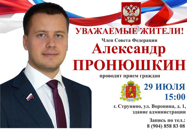 29 июля член Совета Федерации Федерального Собрания Российской Федерации Александр Пронюшкин проведет личный прием граждан в Струнино.