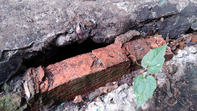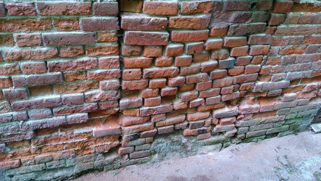 Даже при поверхностном осмотре северной стены здания хорошо видно, как влага разрушает стены здания. Где-то куски камня, а где-то целые кирпичи легко вываливаются из стены… Между стеной и фундаментом всюду зияют трещины и дыры, сама стена покрыта толстым слоем мха… По грязи на окнах первого этажа видно, что недавно текущая по желобу вода поднималась выше уровня подоконников первого этажа. Не мудрено, что в итоге она оказывается в офисах несчастных арендаторов.