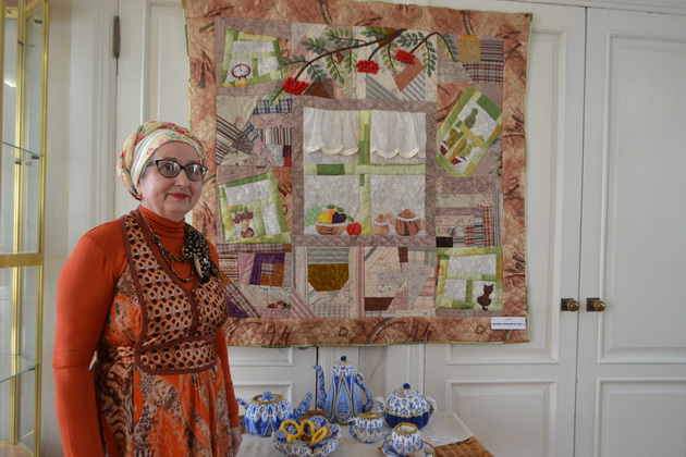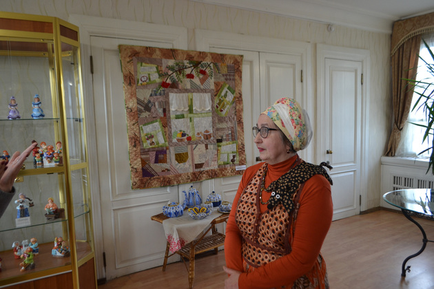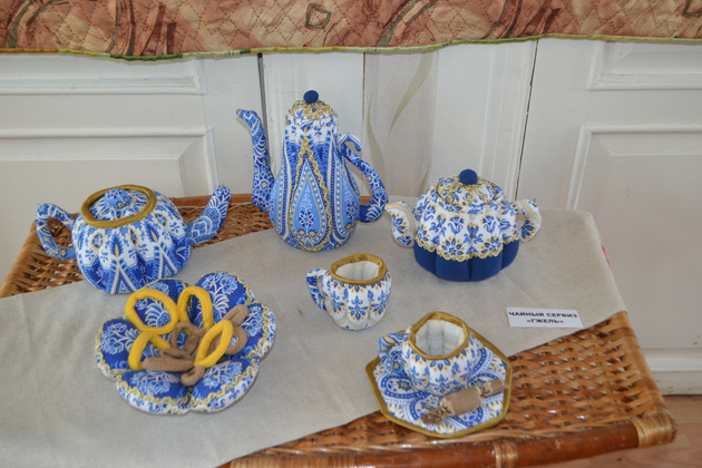 Кроме лоскутных картин Людмилы Яндола, здесь можно увидеть ее мягкие игрушки и удивительный гжельский чайный сервиз, созданный из текстильных материалов.