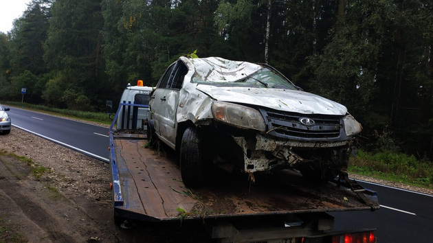 После столкновения с диким зверем автомобиль "Лада Гранта" вылетел в кювет и перевернулся. В аварии пострадали водитель легковушки и трое его пассажиров.