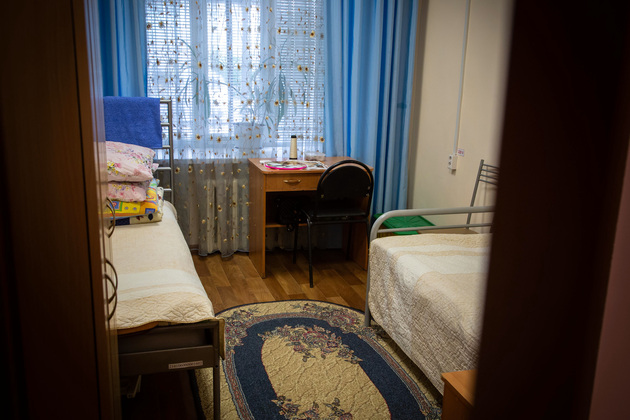 В спальнях – удобные кровати, новые подушки и постельное белье. В гостиной можно посидеть на диване с книгой, укрывшись пледом, покормить золотых рыбок в аквариуме или обняться с большим плюшевым медведем. Здесь же сотрудники отделения проводят занятия по шитью, вышивке и даже йоге.