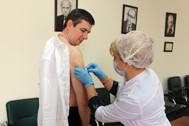 Кроме того проводится выездная вакцинация работников предприятий и организаций. 23 сентября от гриппа привились сотрудники департамента здравоохранения АВО во главе с директором Алексеем Мозалёвым.