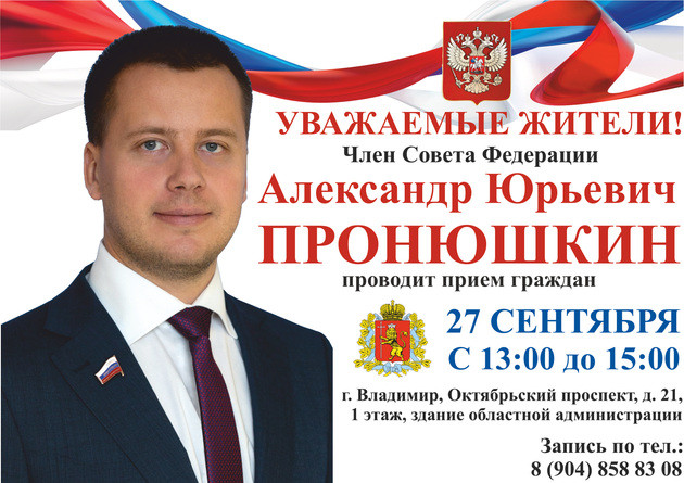 27 сентября член Совета Федерации Федерального Собрания Российской Федерации Александр Пронюшкин проведет личный прием граждан во Владимире.