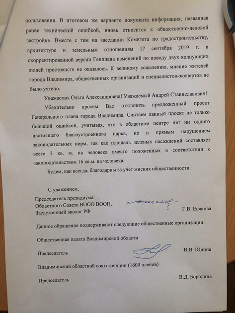 "К великому сожалению, мнение жителей города Владимира, общественных организаций и специалистов-экспертов не было учтено", - говорится в письме региональной Общественной палаты на имя главы города и главы городской администрации.
