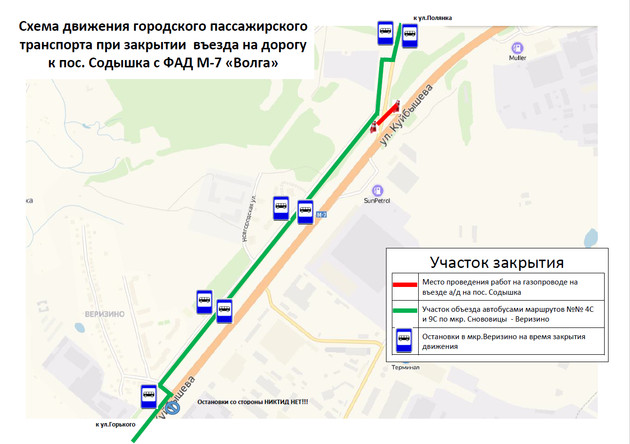 Автомобилистам необходимо будет осуществлять объезд по автодороге в мкр. Веризино от дома №5 по улице Куйбышева до поворота на улицу Опольевскую.