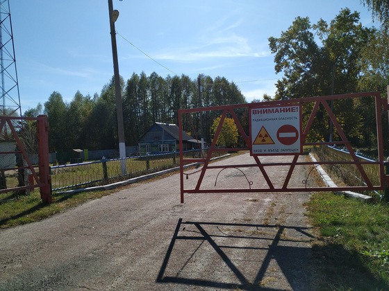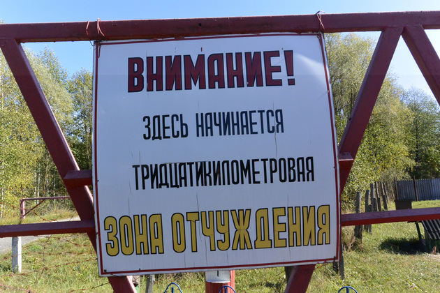 Следующая остановка - КПП «Майдан». За ним начинается 30-километровая зона. Повсюду знаки, предупреждающие о радиационной опасности. Налево и направо от КПП уходят грунтовые дороги, но они перекрыты, так же, как и тридцать лет назад. Замеряем уровень радиации. Больше, чем в Бабчине, но работники заповедника утверждают, что ерундовые показатели - будет и круче. Не обманули - было. Однако, уточняют, распределение радионуклидов по территории мозаичное, неравномерное. На незначительном расстоянии плотность загрязнения может отличаться многократно. Самая большая опасность — пыль, именно поэтому экскурсантам раздают респираторы. Чтобы не вдыхали опасный воздух, не заражались изнутри: внутренне воздействие облучения на организм гораздо опаснее внешнего.
