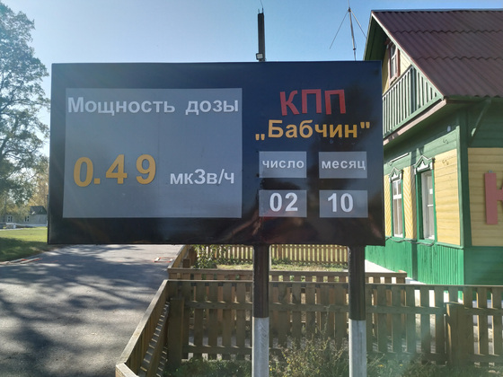 На территории Полесского государственного радиационно-экологического заповедника восемь контрольно-пропускных пунктов. Мы подъезжаем к КПП «Бабчин». На аншлаге - сегодняшние показатели радиационного фона: 0,49 мкЗв (микрозиверт в час). Превышение, говорят спецы, незначительное. Норма же - 0,2 мкЗв. Фото на память у шлагбаума и дальше в путь.