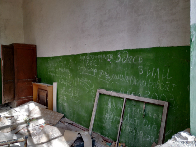 Осматриваем заброшенные дома, заглядываем в школу-восьмилетку. У школы радиационный фон превышает норму в 28 раз! Перевернутые парты, разбросанные книги, тетради... На школьной доске мелом выведены приветы бывшим одноклассникам. Они написаны, кажется, не так давно. Видимо, кто-то из местных жителей все же бывал в Борщевке после 1986-го.