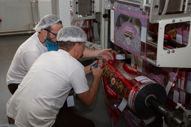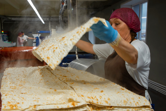 Постоянно здесь работают два оператора линии, а вот количество упаковщиц зависит от объёма заказа. В среднем на производство и упаковку половины тонны лаваша уходит около шести часов.