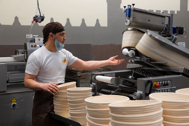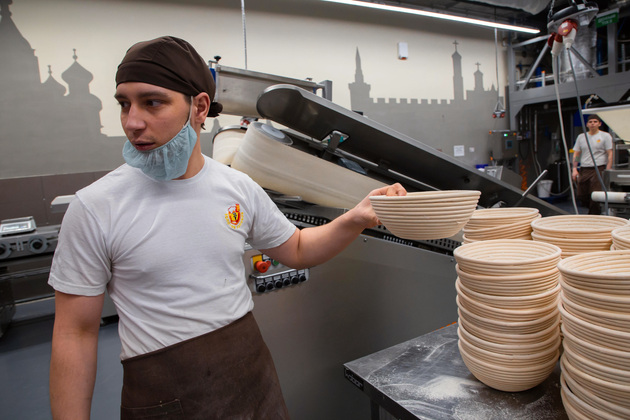 Оборудование здесь немецкое и итальянское (цена 230 млн рублей, уровень — сопоставим с «мерседесом» в автомобилестроении), а работе на нём всех мастеров-пекарей компания за свой счёт обучила в Германии.
