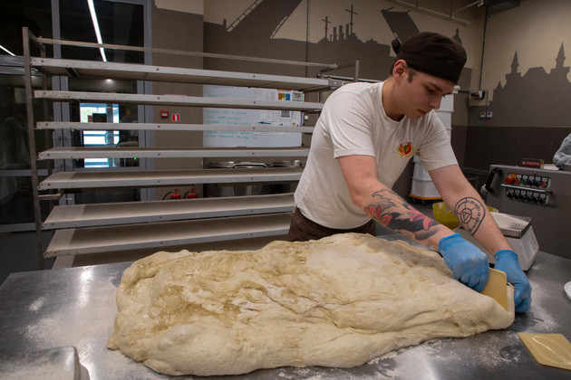 Руководит здесь Михаил Тимофеев — один из тех выросших на комбинате кадров, кому ещё нет и 30 лет. Говорит, что оборудование в цехе особенное — идеально имитирует ручной замес, но — в четыре раза быстрее.