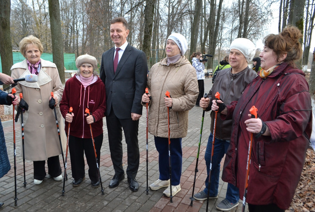 Губернатор встретил в парке группу пожилых женщин, занимающихся скандинавской ходьбой. И это только один вид полезной активности горожан на аллеях и площадках парка.