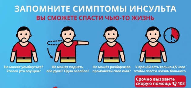 Каковы основные симптомы инсульта? - внезапная слабость, онемение в руке или ноге; нарушение речи или ее понимания; потеря равновесия, нарушение координации, головокружение; обморок, потеря сознания; резкая головная боль; онемение губы, половины лица, перекос лица.