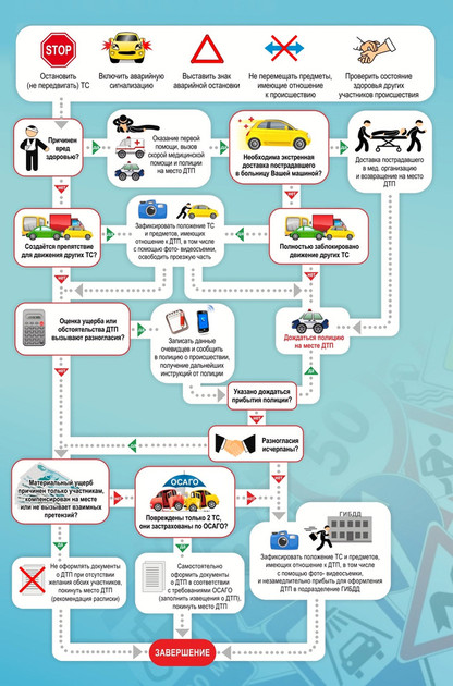 Действия водителя в случае мелкого ДТП: в первую очередь необходимо установить знак аварийной остановки. Если участники ДТП нашли общий язык, то они рисуют схему ДТП, убирают машины с проезжей части, заполняют извещение о ДТП и разъезжаются. Пострадавший едет в свою страховую компанию с лицевой частью извещения, у виновника ДТП остается его копия. И далее страховая компания действует по своему алгоритму.