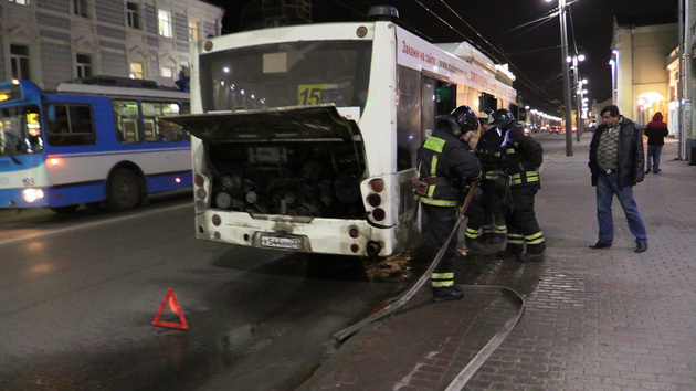 7 ноября во Владимире загорелся еще один автобус. Вечером в центре города произошло возгорание в двигателе "Волгабаса" 15-го маршрута. В салоне находилось 30 пассажиров.