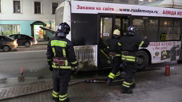 Автобус, двигавшийся по маршруту № 15 в сторону Золотых ворот, загорелся на перекрестке улиц Гагарина и Большой Московской. Сообщение о пожаре в МЧС поступило в 19.11.